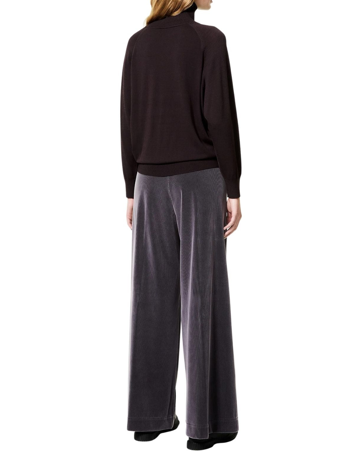 Maglia a collo alto si distingue per la vestibilità avvolgente e il fit confortevole, pensato per valorizzare con sobrietà la purezza delle forme. Realizzata in tessuto hybrid con inserto in finissimo Cupro sul davanti, presenta una mano setosa e si illumina di riflessi naturali che ne esaltano la raffinatezza.